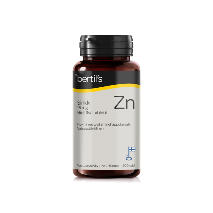 Kotimaiset bertil’s Sinkki -tabletit sisältävät aminohappokelatoitua sinkkiä. Sinkki on tärkeä hivenaine elimistön kaikissa rakennus- ja uudistumistoiminnoissa. Sen vaikutukset näkyvät parhaiten nopeasti uudistuvien kudosten kuten ihon, hiusten ja kynsien hyvinvoinnissa. Sinkkiä tarvitaan lisäksi vastustuskyvyn ylläpitoon, hedelmällisyyden ja testosteronitasojen tukemiseen sekä mm. aivoille tärkeiden omega-3-rasvahappojen rakentamiseen.