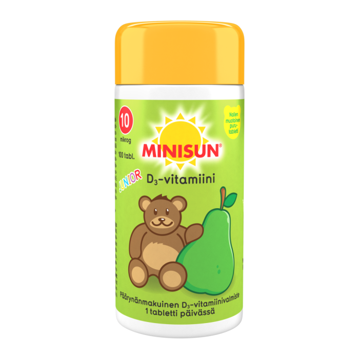 Minisun Junior Nalle on helppo tapa turvata lapsen päivittäinen D-vitamiinin saanti. Minisun Junior Nalle on maukkaan päärynän makuinen ja nallen muotoinen tabletti, joka on helppo pureskella tai imeskellä. Hyvänmakuiset purutabletit sisältävät 10 mikrogrammaa tehokkaasti imeytyvää D3-vitamiinia. D-vitamiini on tarpeellinen lasten luuston ja hampaiden pysymiselle normaaleina. Lisäksi D-vitamiini edistää immuunijärjestelmän normaalia toimintaa lapsilla. Valmisteessa ei ole lisättyjä väriaineita. Minisun D-vitamiini Junior on lisäksi gluteeniton, laktoositon, maidoton ja soijaton.