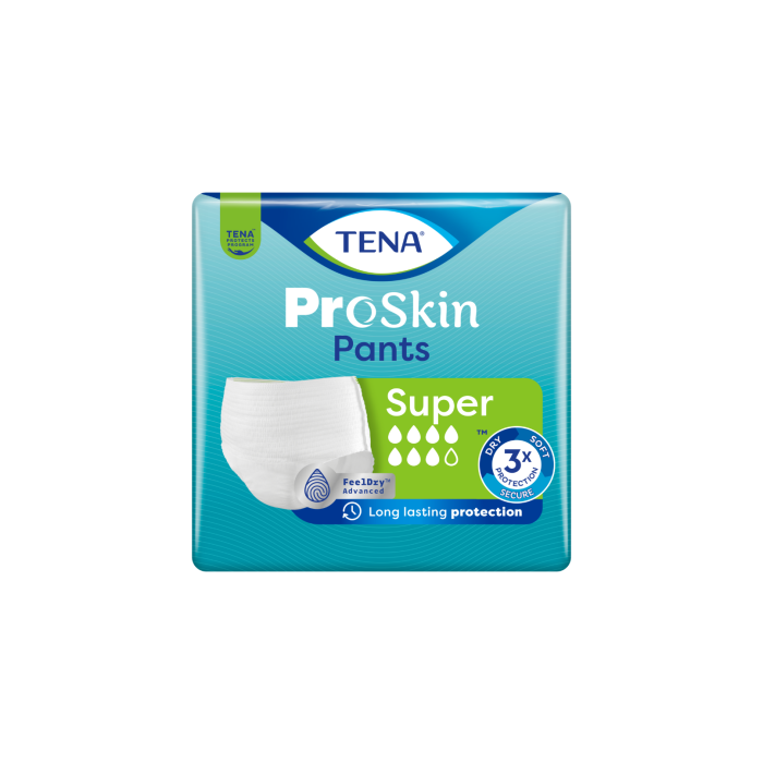 TENA ProSkin Pants Super Inkontinenssibyxor skyddar upp till 100 % mot måttlig till svår urinläckage. De absorberar snabbt vätska och håller huden torr länge, dag som natt. Dessa pålitliga engångsskydd är designade för en aktiv livsstil för både kvinnor och män. Tack vare FeelDry Advanced™-teknologin absorberas vätskan på några sekunder, låses in i lagren och håller huden torrare och bättre skyddad. Den absorberande kärnan neutraliserar lukt omedelbart, vilket gör skyddet diskret och dig mer självsäker. Mjuka och bekväma TENA ProSkin Pants håller huden torr och skyddar pålitligt mot urinläckage – så att du kan leva ditt aktiva liv som du vill. -Långvarigt skydd -FeelDry Advanced™ -Huden hålls skyddad